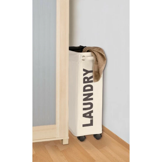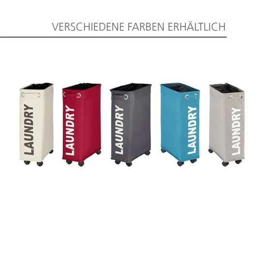 Der platzsparende, schmale Wäschesammler ist dabei aus hochwertigem Polyester gefertigt und unkompliziert durch seine vier Rollen verschiebbar. Durch die Sichtschutzabdeckung kann die unschöne Schmutzwäsche gelungen versteckt werden. So können Nischen und Ecken ab sofort zum praktischen Stauraum werden.