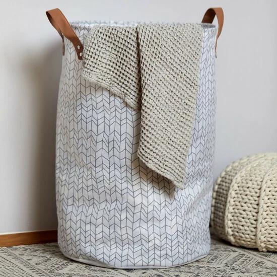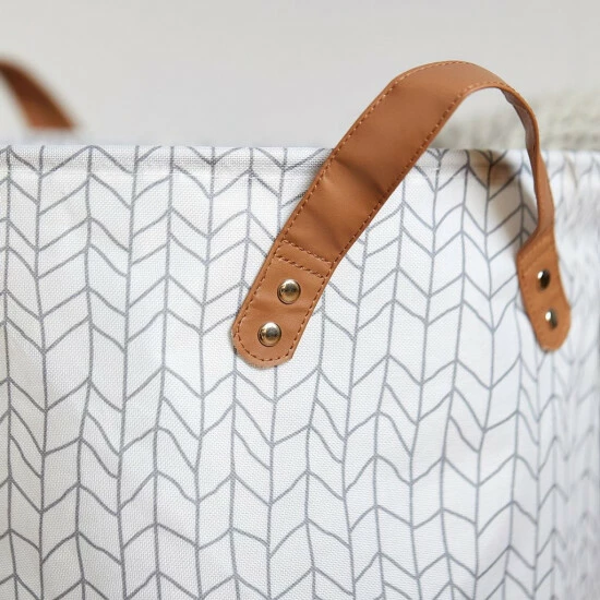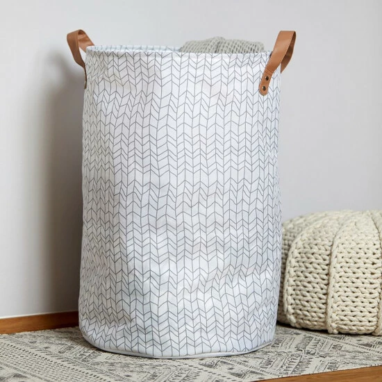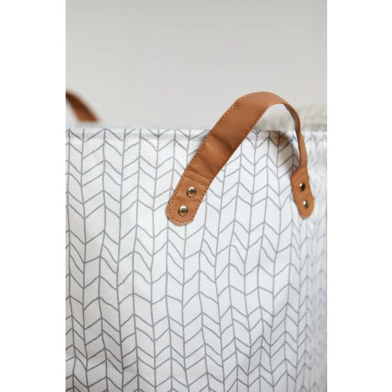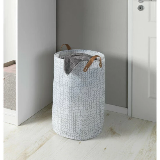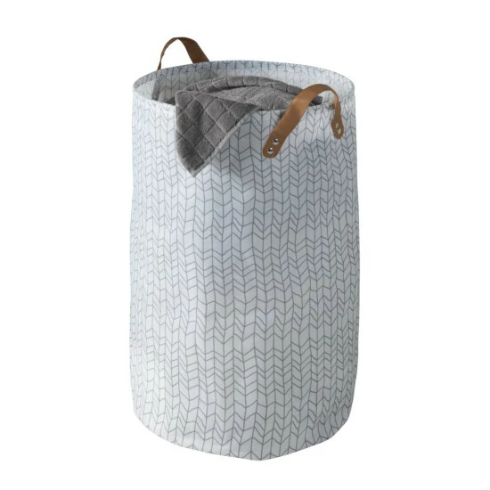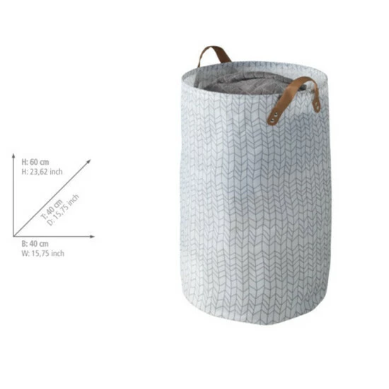 Mit seinem eleganten Muster auf weißem Grund und den braunen Griffen verleiht der Wäschesack jedem Raum, egal ob Schlafzimmer, Badezimmer oder Keller, ein modernes Flair.
