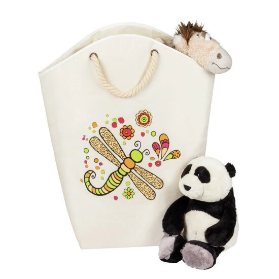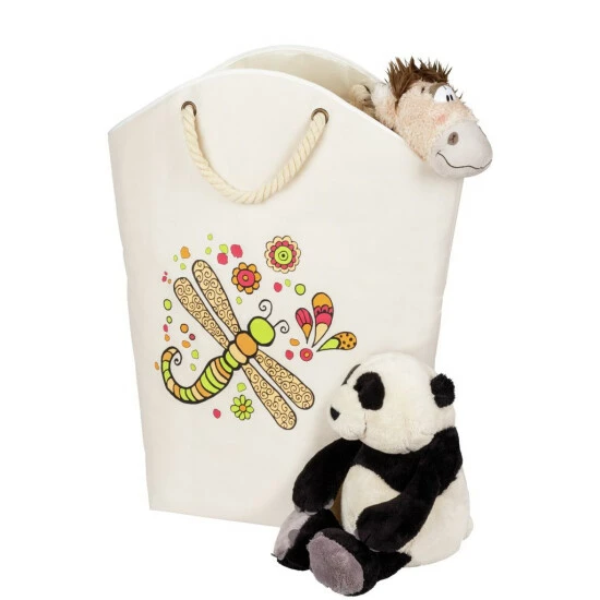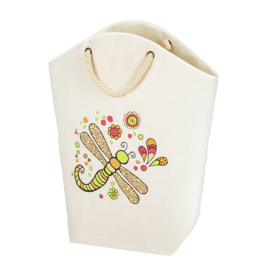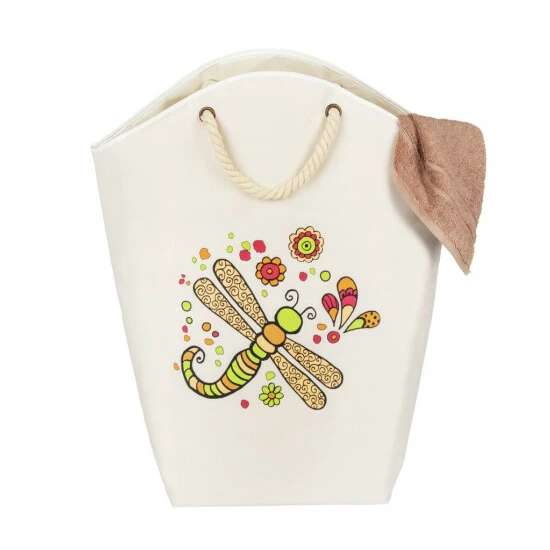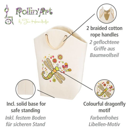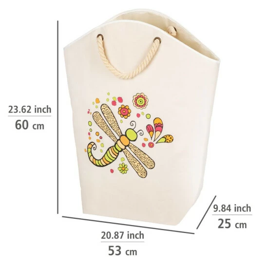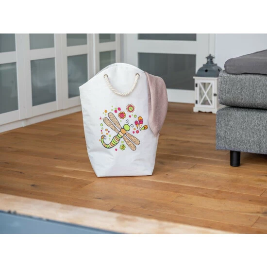 In behaglichem Cremeton gehalten wird das aufgedruckte farbenfrohe Libellen-Motiv mit einer Abmessung von 25 x 28 cm zum absoluten Highlight. Schön, aber unaufdringlich bringt der Wäschekorb so ein wenig Farbe in Ihren Alltag. Harmonisch abgerundet wird das moderne Design des Sammlers mit 58 Liter Volumen durch die beiden hochwertigen, geflochtenen Baumwollseil-Griffe, die sich an den Seiten befinden. Das ermöglicht einen einfachen Transport der Schmutzwäsche zur Waschmaschine. Durch die beiden Henkel, die auf den Wäschesammler abgestimmt, ebenfalls in gemütlicher Creme-Farbe gehalten sind, eignet sich das Wohnaccessoire auch ideal als Tragetasche, zum Beispiel für Pfandflaschen oder Einkäufe.