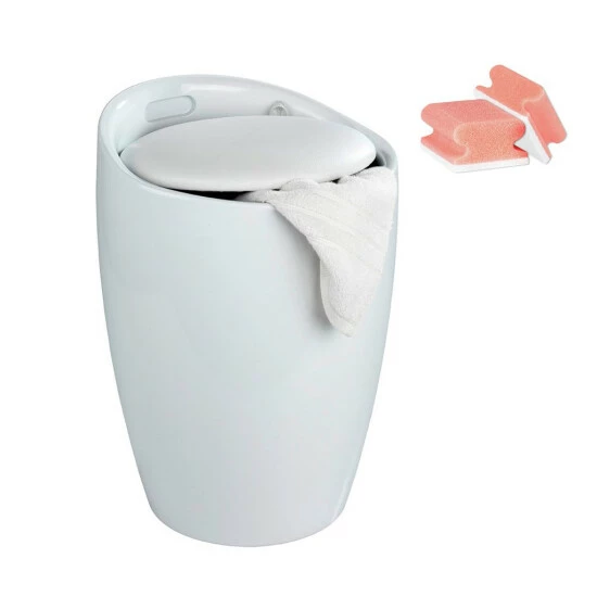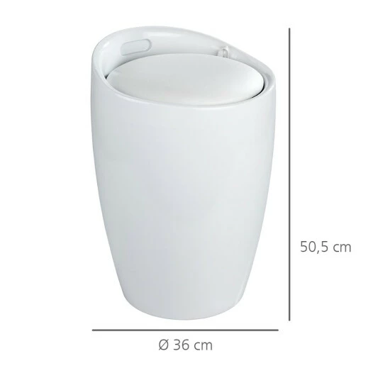 Der trendige Badhocker und Wäschesammler Candy ist aus stabilem ABS-Kunststoff gefertigt. Mit seinem klassischen Weiß wird das moderne Accessoire zum Hingucker in jedem Bad.
