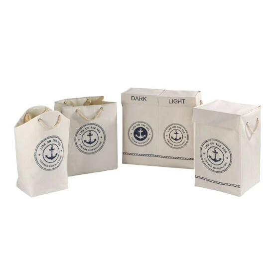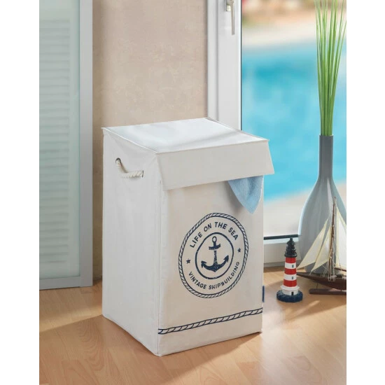 Wäschesammler aus hochwertigem Polyester in trendigem maritimen Design. Mit praktisch verschließbarem Deckel und geflochtenen Tragegriffen.