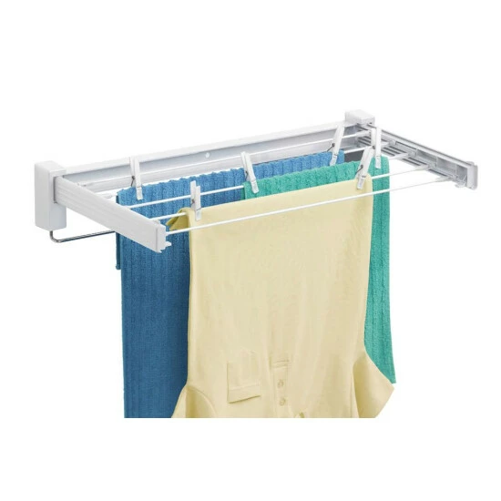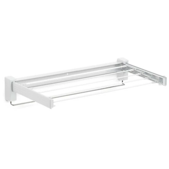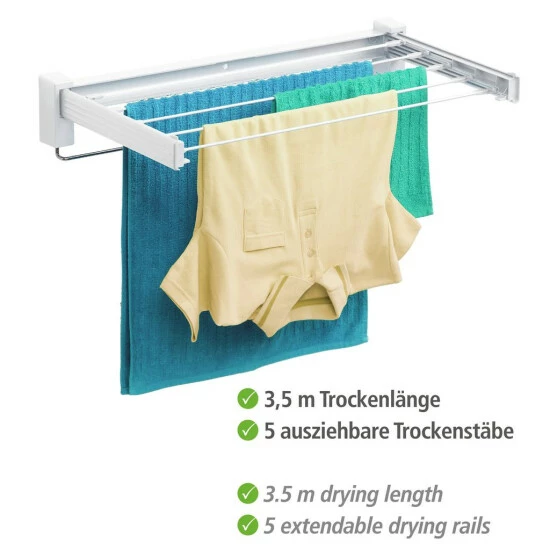 Fünf nach vorn ausziehbare Trockenstäbe zu je 57,5 cm bieten viel Platz zum Wäschetrocknen. Die kunststoffummantelten Stahl-Trockenstäbe sind nach Gebrauch wieder versenkbar, so dass die Stäbe nicht verschmutzen. Der zusammengeklappte Wäschetrockner hat dann nur noch eine Tiefe von 5 cm.