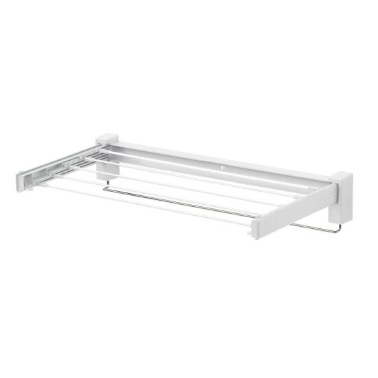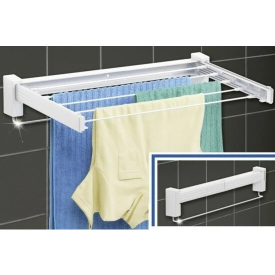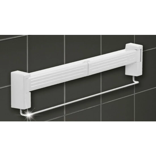 Unter dem ausklappbaren Teil des Trockners ist zusätzlich eine Edelstahl-Handtuchstange mit einer Länge von 63 cm angebracht.