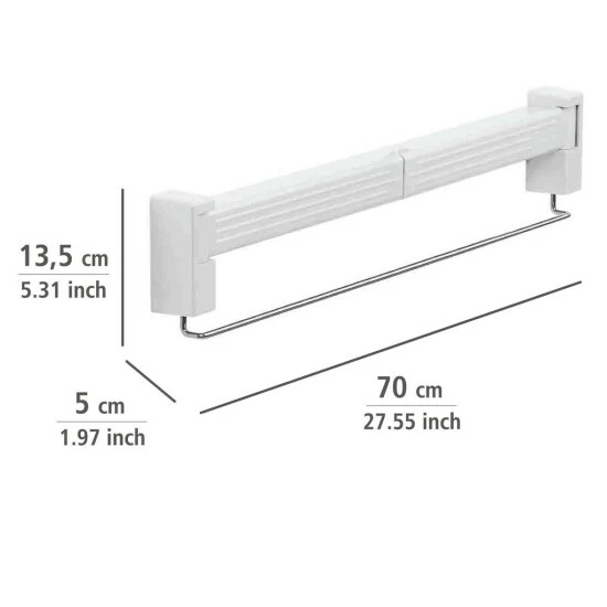Spezifikationen:Farbe: weiß, silber Besonders empfohlen für: unisex Material: Edelstahl, Kunststoff Maße zusammengeklappt: 70 x 5 x 13,5 cm (L x B x H) Maße aufgeklappt: 70 x 36 x 10,5 cm (L x B x H) Trocknungslänge: 3,5 m