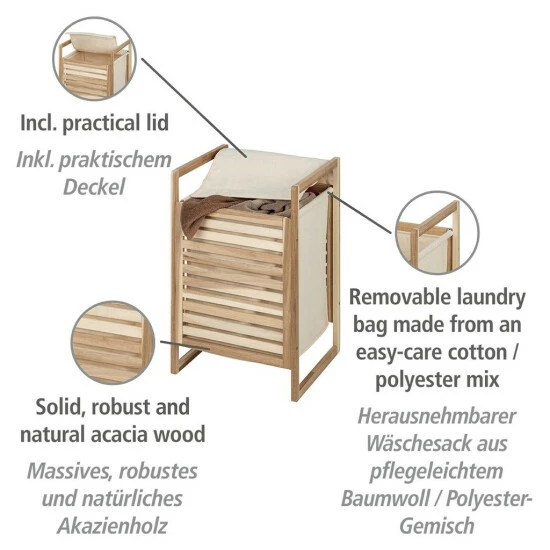 Wäschekorb aus Holz von WENKO mit ACINA-Materialbeutel ist ein Bad- oder Wäschezubehör, mit dem Sie Kleidung für Wäsche aufbewahren können. Eine angemessene Lagerung von Kleidung ist normalerweise nicht wichtig, da sie ihre Fitness und unsere Gesundheit direkt beeinträchtigen kann. Wäschekorb aus Holz mit ACINA-Materialbeutel kann sich einer angemessenen Belüftung rühmen.