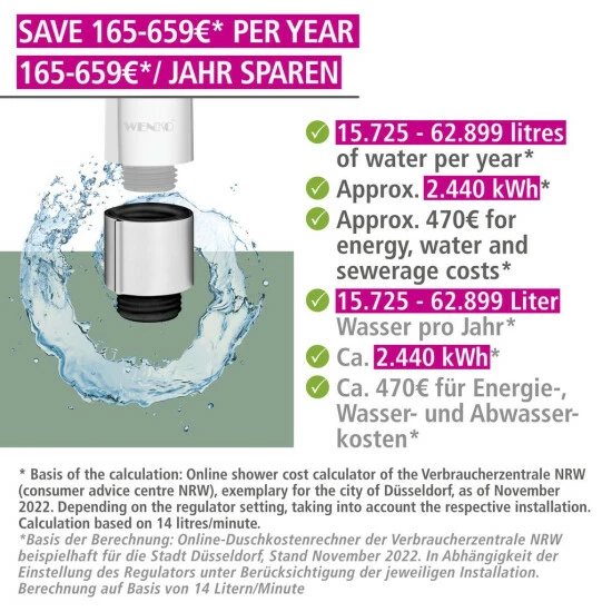 Der Wasserspareinsatz für die Dusche lässt sich jederzeit nach Belieben einstellen und spart so zwischen 15 und 60 % Wasser ganz ohne Komfortverlust. Das schont nicht nur die Ressourcen, sondern auch den Geldbeutel. Der Durchfluss wird individuell geregelt, sodass so viel Wasser eingespart wird, wie es in der Situation gewünscht ist.