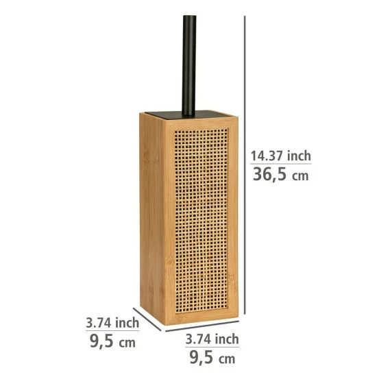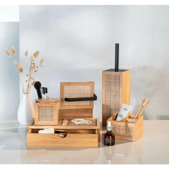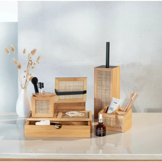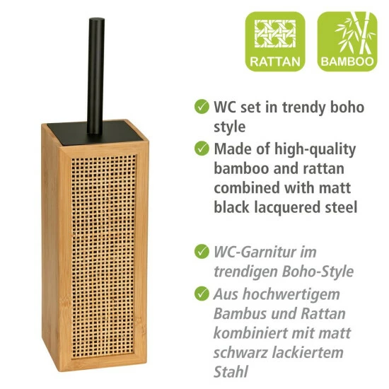 Die WC-Garnitur besteht aus hochwertigem Bambus. Damit punktet das trendige Bad-Accessoire auch in Sachen Nachhaltigkeit, denn Bambus ist ein schnell nachwachsender Rohstoff. Besonders macht den Behälter das optische Highlight aus Rattangeflecht, das den Boho-Look komplett macht.