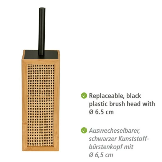 Ausgestattet ist die WC-Garnitur, die insgesamt (B x H x T): 9,5 x 36,5 x 9,5 cm misst, mit einer Toilettenbürste, die für eine hygienische Reinigung der Toilette sorgt. Der Stiel mit Abdeckung besteht aus matt lackiertem Stahl in Schwarz. Die Farbe ergänzt den Boho-Stil um einen trendigen Akzent, der aus dem Toilettenbürstenhalter ein modernes Bad-Accessoire macht. Der Bürstenkopf (Ø 6,5 cm) aus Kunststoff in Schwarz ist auswechselbar.