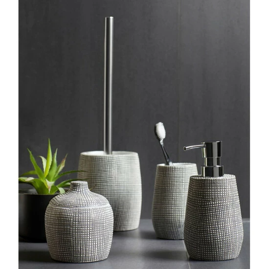 Die Bad-Accessoire Serie Gilba von Wenko mit asymmetrischem Muster und strukturierter Oberfläche in Grau setzt natürliche Akzente in Ihrem Badezimmer & Gäste-WC.