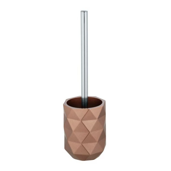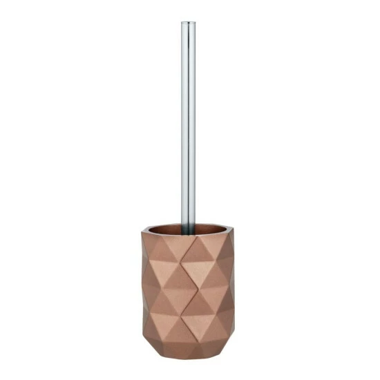 Die WC-Garnitur Lanciano beeindruckt durch ihr auffälliges Design. Der Behälter aus dem hochwertigen Kunststoff Polyresin hat eine strukturierte Oberfläche mit geometrischem Rautenmuster, das bei Lichteinfall glänzend erscheint. Die Farbe Bronze macht den unverzichtbaren Alltagsgegenstand zu einem eleganten Bad-Accessoire, das sofort ins Auge fällt. Die WC-Bürste mit schwarzem, auswechselbaren Bürstenkopf (Ø 8 cm) aus Kunststoff rundet das Design mit dem eleganten silberfarbenen Stiel aus Edelstahl ab.
