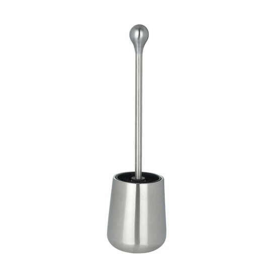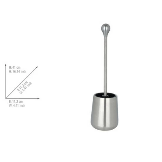 Hochwertige, moderne WC-Garnitur in offener FormAus schwerem, rostfreiem Edelstahl, satiniertIm elegant-modernen DesignInkl. WC-Bürste mit auswechselbarem, schwarzem Bürstenkopf von Ø 7,5 cmMaße (B/T x H): Ø 11,2 x 41,5 cm