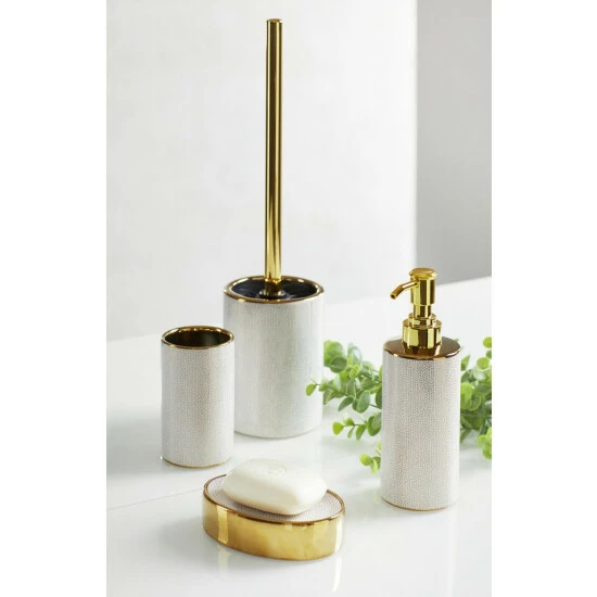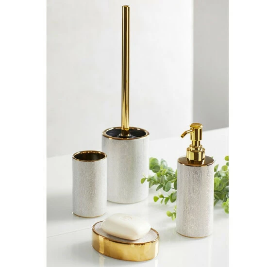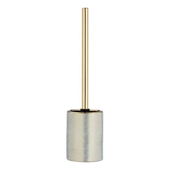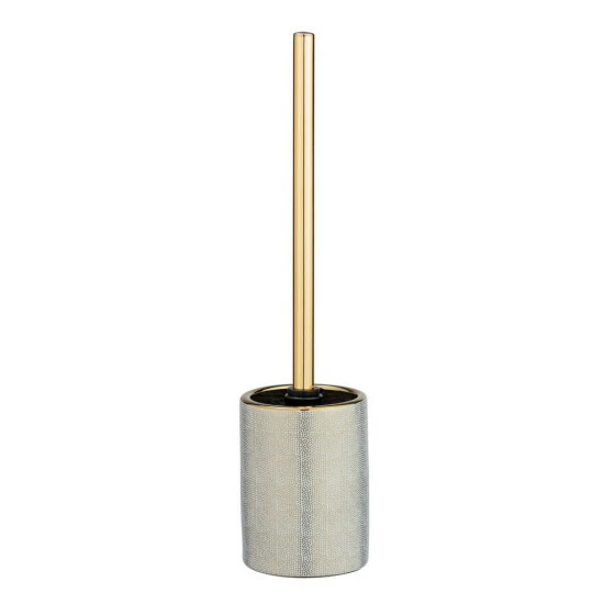 Die bezaubernde, flexibel aufstellbare WC-Garnitur Nuria im glamourösen Gold/Weiß reinigt problemlos und gründlich Ihr WC. Die Bürste leistet durch ihre strapazier- und anpassungsfähigen Borsten eine stets zuverlässige Nutzung. Die im Lieferumfang enthaltene WC-Bürste ist mit einem schwarzen, auswechselbaren Bürstenkopf von Ø 8 cm versehen. Der hochwertige Bürstenkopf ist aus Silikon gefertigt. Seine spezielle Anti-Haft-Wirkung sorgt dafür, dass sich hartnäckige Reste und Toilettenpapier nicht in der Bürste festsetzen, sondern beim Reinigen einfach weggespült werden. So bleibt die clevere Bürste immer hygienisch sauber und reinigt sich selber.