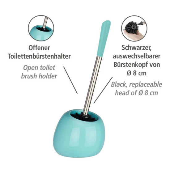 C-Accessoires, Badutensilien und Baddekorationen aus der neuen WENKO Kollektion sind außergewöhnlich elegantes Design, modische und vielseitige Farben, hochwertige Verarbeitung und praktische und langlebige Rohstoffe. Blauer Badezimmerbehälter mit Toilettenbürste aus der Serie „Polaris“ ist ein funktionelles Toilettenset mit einem sehr originellen und ästhetischen Aussehen, dassich auf aktuellen Minimalismus und klassische Einfachheit bezieht. Der elegante Keramikbehälter, in dem die Toilettenbürste platziert ist, wird in allen stilvollen Bädern und Toilettenräumen sehr gut aussehen . Gleichzeitig ist es obligatorisch und notwendig, das Badezimmer auszustatten. Darüber hinaus sind blaue Badezimmerzubehör immer eine sehr gute Wahl für die Dekoration eines Badezimmers oder einer Toilette. Der Toilettenbürstenbehälter ist aus dekorativem und perfekt als Material für Badaccessoires, Keramik gefertigt. Keramik ist langlebig, hygienisch und verträgt die Bedingungen des Badezimmers gut. DerBürstenstab ist stabil, fest fixiert und liegt gut in der Hand, um eine noch intensive Reinigung der Toilettenschüssel zu erleichtern.