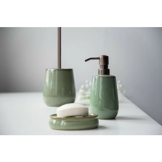 Lieferumfang: WC-Garnitur in Grün aus hochwertiger Keramik, Ø 10,5 x 40 cm, mit akzentuiertem Becherrand in Kupfer, inklusive WC-Bürste, Stiel aus hochwertigem Kunststoff in Kupferfarben, Bürstenkopf Ø 8,5 cm in Schwarz, aus robustem Kunststoff