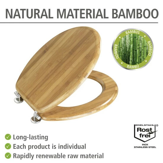 Die Natur des Bambus-Holzes lässt jeden WC-Sitz in Farbe und Maserung zu einem Unikat werden. Durch seine Mehrfachlackierung hat er eine leicht zu reinigende, feuchtigkeitsresistente, porenfreie Oberfläche.