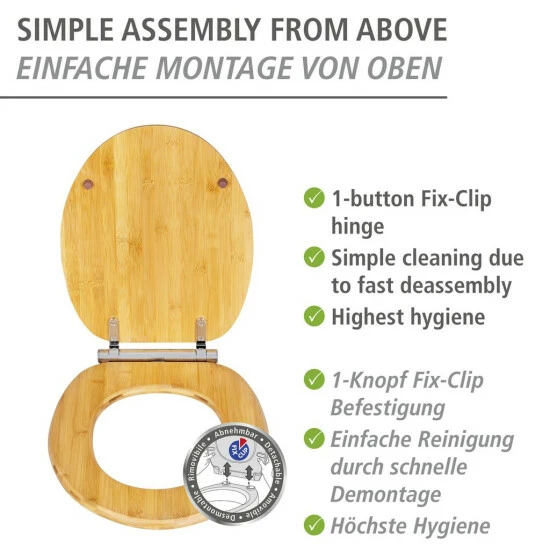 Dank der externen Easy-Close-Absenkautomatik gehört lautes Deckelknallen der Vergangenheit an. Zuverlässig schließt der Toilettendeckel sanft und leise. Als weitere praktische Zusatzfunktion verfügt der WC-Sitz Bambusa über eine 1-Knopf-Fix-Clip Hygienebefestigung aus stabilem Kunststoff (ABS).
