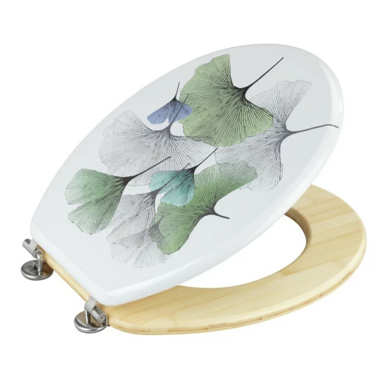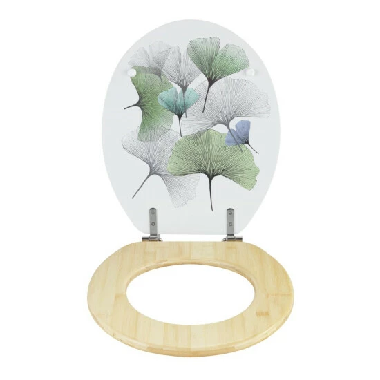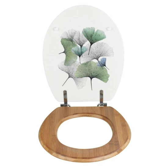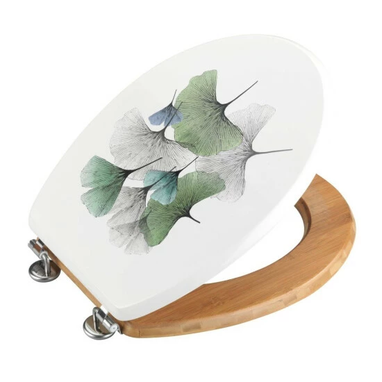 Der WC-Sitz Ginkgo aus hochwertigem MDF kombiniert mit nachhaltigem Bambus hat eine klassische ovale Deckelform. Das bezaubernde Ginkgo-Design auf weißem Hintergrund verleiht Ihrem Bad eine harmonische Atmosphäre. Der Ginkgo wird seit Jahrhunderten als kraftspendend und lebensverlängernd verehrt. Neben dem angenehmen Sitzkomfort ist der Toilettensitz auch mit praktischen Zusatzfunktionen ausgestattet.