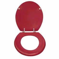 Der WC-Sitz Prima im Retro-Style bringt mit seinem intensiven Bordeauxrot Farbe ins Badezimmer. Er bietet angenehmen Sitzkomfort. Deckel und Brille haben eine rundliche Form.