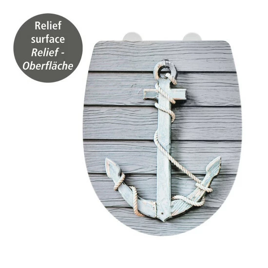 Der hochwertig verarbeitete WC-Sitz Rope aus Thermoplast hat eine klassische ovale Deckelform. Er verfügt nicht nur über einen angenehmen Sitzkomfort, sondern ist mit praktischen Zusatzfunktionen ausgestattet. Die ausgefallene Oberfläche mit Relief-Haptik und erhabenem Anker wird zum Blickfang in jedem Badezimmer und versprüht maritimes Flair.
