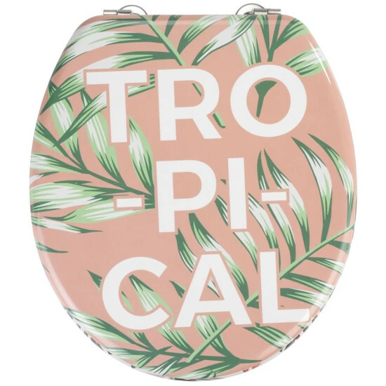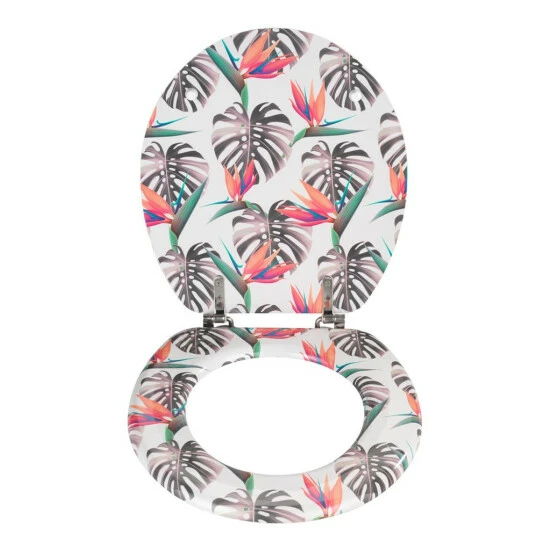 Tropisches Sommer-Feeling bringt der ausgefallene WC-Sitz Tropical ins heimische Bad und Gäste-WC und erfrischt mit seinen tropischen Pflanzen-Motiven das stille Örtchen. Der komfortable Toiletten-Sitz hat eine ovale Form und bietet angenehmen Sitzkomfort.