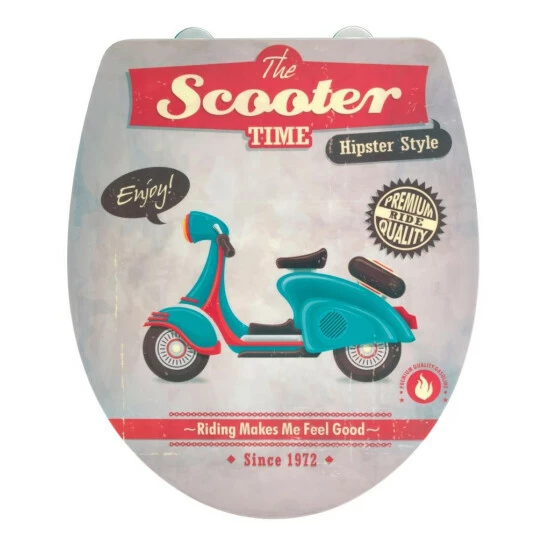 Als ein echtes Deko-Highlight präsentiert sich der nostalgisch im Retrolook gestaltete WC-Sitz Vintage Scooter. Mit seinem Roller-Motiv bietet er den perfekten Look für jedes Badezimmer und Gäste-WC. Seine ausgefallene Hochglanz-Oberfläche setzt das Retro-Motiv perfekt in Szene.