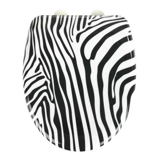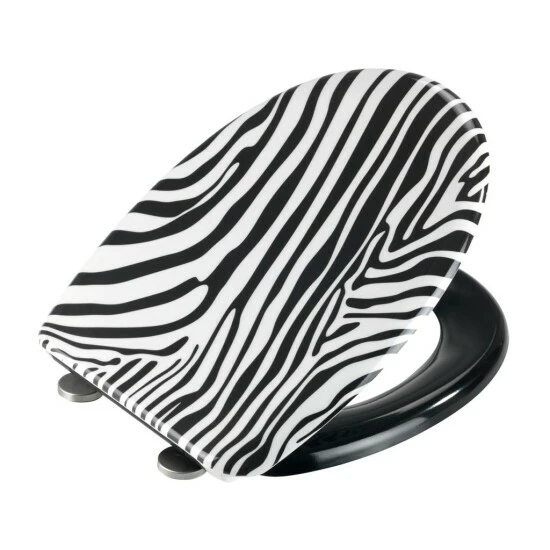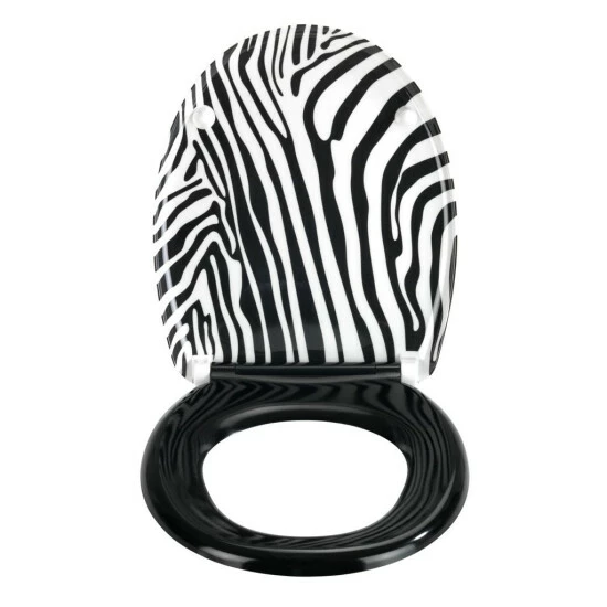 Besonders angesagt ist der Zebramuster-Druck auf beiden WC-Deckelseiten kombiniert mit einer schwarzen WC-Brille. Das in schwarz-weiß gehaltene Animalprint-Motiv bringt einen Hauch von Wildnis in Ihr Bad.