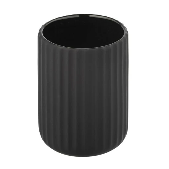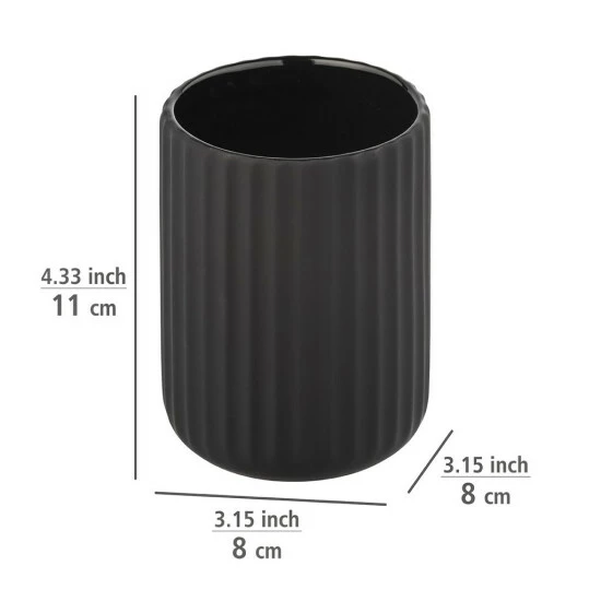 Das attraktive Zubehör der aufeinander abgestimmten Bad-Serie ist aus hochwertiger Keramik gefertigt. Der stilvolle Zahnbürstenhalter in einheitlichem, mattschwarzem Finish überzeugt mit einer griffigen Soft-Touch Beschichtung sowie seiner komfortablen Abmessung von Ø 8 x 11 cm. Nutzen Sie den extravaganten Becher zur ordentlichen Aufbewahrung von elektrischen Zahnbürsten, Handzahnbürsten und Zahnpasta. Auf diese Weise hat alles seinen Platz und seine Ordnung. Die flexible Platzierung des außergewöhnlichen Bechers hält Ihre Zahnpflegeprodukte im Badezimmer beständig griffbereit!
