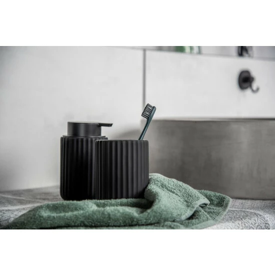 In elegantem, angesagtem Mattschwarz gehalten und mit einer aufwendig strukturierten Oberfläche versehen, können Sie mit der Bad-Accessoires Serie Belluno in jedem Badezimmer und Gäste-WC auftrumpfen. Das Zusammenspiel der gleichbleibenden, vertikalen Rillen – in Verbindung mit den verführerischen Rundungen des Produktes – verleihen dem imponierenden Zahnputzbecher das gewisse Etwas.