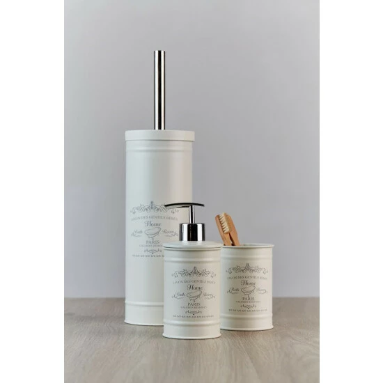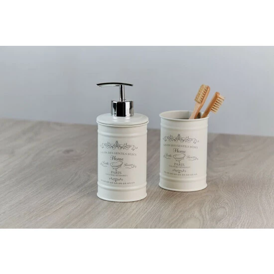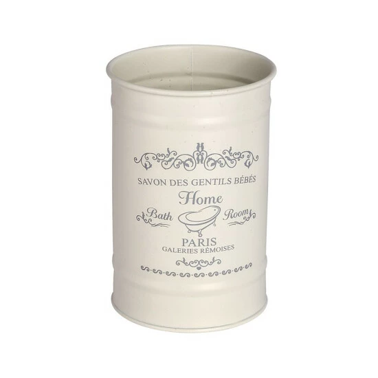 Zahnbürstenhalter aus der HOME PARIS Zubehörserie. Es ist aus hochwertigem lackiertem Stahl gefertigt. Es ist auch perfekt für die Aufbewahrung von Pasten, Kosmetika und anderen Badezimmeraccessoires. Stylisch, in der Farbe einer zarten Creme, mit einem attraktiven Druck, ideal für rustikale Interieurs und SPA-Salons.
