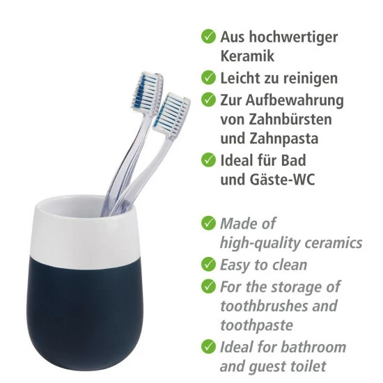 Durch die freundliche und frische Farbkombination und das besondere Design vermittelt der Zahn-Becher einen besonders edlen Eindruck und ist nicht nur ein unverzichtbares Utensil bei der täglichen Mundpflege sondern auch ein ansprechendes Accessoire für jedes Badezimmer. Durch die Verwendung von hochwertiger Keramik ist dieser Becher leicht zu reinigen.