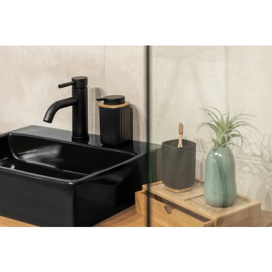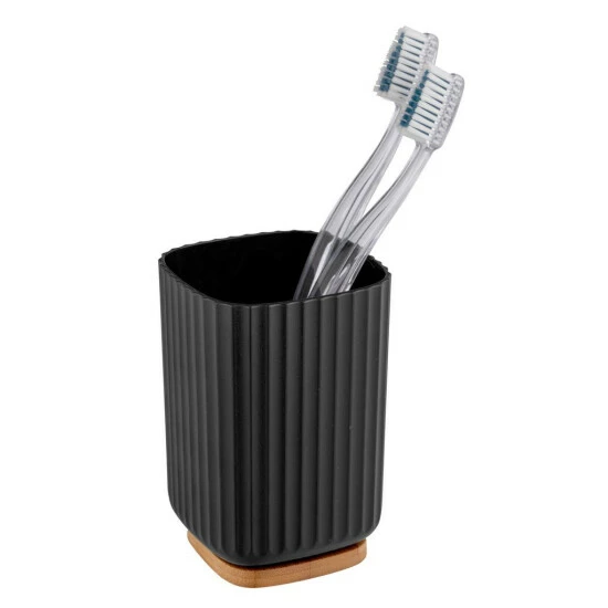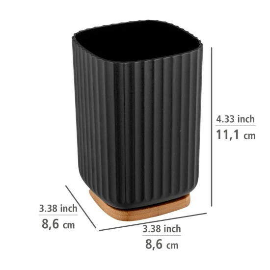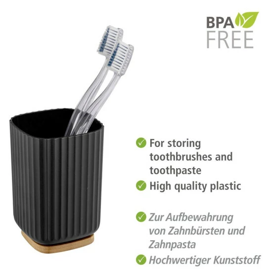 Alltagsgegenstände stilvoll aufbewahren – der Zahnputzbecher Rotello in Schwarz bietet Zahnbürsten, Zahncremes und anderen Utensilien einen geeigneten Platz zum Abstellen. Die Serie Rotello von WENKO kombiniert hochwertigen Kunststoff mit dem schnell nachwachsenden Rohstoff Bambus. Modernes Design trifft hier auf die natürliche, hellbraune Farbe von Holz.