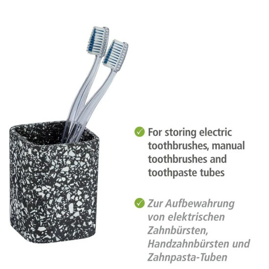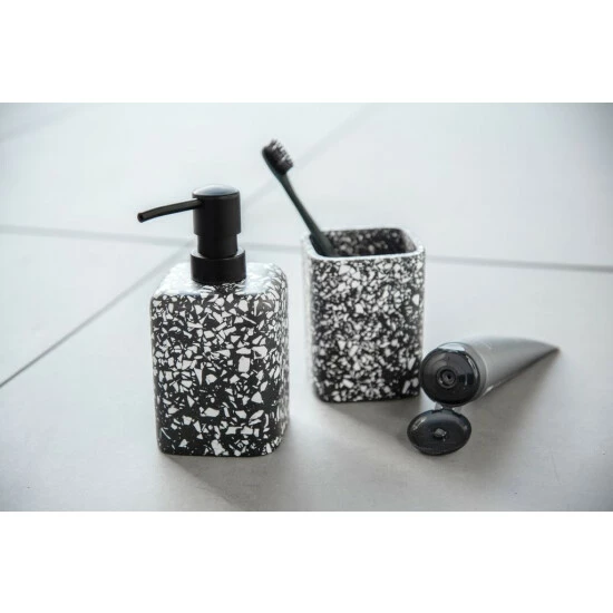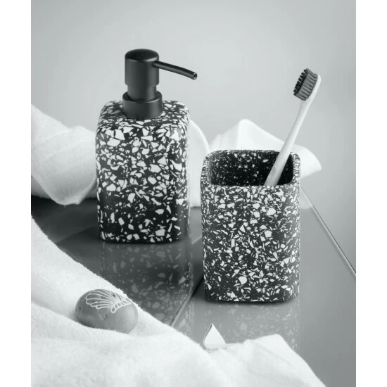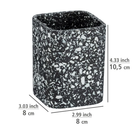 Der extravagante Zahnbürstenhalter Terrazzo schmiegt sich stilvoll auf jede Ablage in Badezimmer & Gäste WC. Zeitgleich bietet er ausreichend Volumen, um Zahnbürste und Zahnpasta einen attraktiven Platz zu geben. Das schöne Accessoire der Serie ist in kantigem Design gehalten. Der mattschwarze Becher besticht mit atemberaubenden Details in Weiß und überzeugt durch einfache Farben. Harmonisch gestaltet fügt sich das Bad-Zubehör so bestens in verschiedene Bäder ein und kann wirkungsvoll auf dem Waschbecken oder praktisch im Badezimmerschrank stehen.